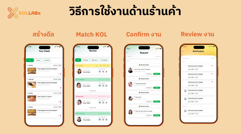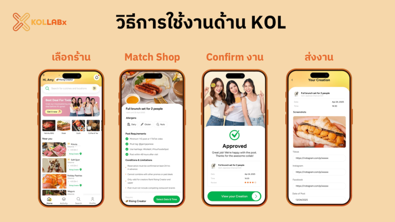 KOLLABX โดดเด่นด้วยจุดแข็ง ฟรีค่าบริการ ใช้งานง่าย โปร่งใส และเป็น One-stop Service ที่ครอบคลุมตั้งแต่การแมตซ์ระหว่างร้านค้ากับ KOL การส่งงาน การประเมินผล ไปจนถึงระบบรีวิวที่ตรวจสอบได้จริง เพื่อช่วยร้านค้าที่เป็น SME โดยเฉพาะธุรกิจร้านอาหารซึ่งเป็นเฟสแรก ให้สามารถโปรโมตสินค้าและบริการได้ตรงกลุ่มเป้าหมายด้วย Nano และ Micro KOL ซึ่งกำลังเป็นเทรนด์ที่ผู้บริโภคเชื่อถือและเข้าถึงง่ายกว่าการรีวิวจากดาราหรืออินฟลูเอนเซอร์รายใหญ่