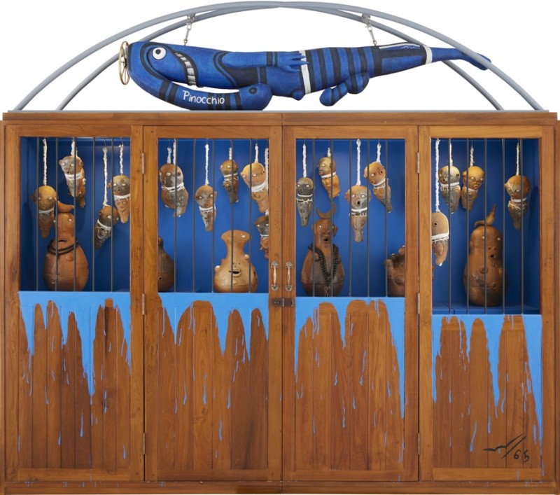 PRISON / คุก (2565) โดย ทวี รัชนีกร : ผลงานสื่อผสมสามมิติที่มีกลิ่นอายการสร้างศิลปะแบบรูปลักษณ์ และการเมืองอย่างชัดเจนจัดจ้าน ซึ่งเป็นแนวทางที่ศิลปินยึดถือมาตลอดเส้นทางงานสร้างสรรค์ ราคาเริ่มต้น 690,000 บาท