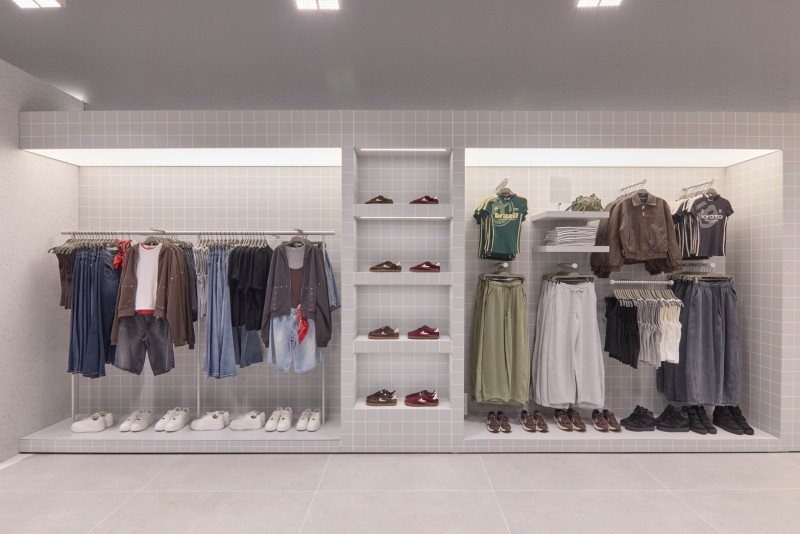 บริเวณภายในร้านถูกออกแบบและจัดวางผังพื้นที่เป็นโซนต่างๆ อย่างชัดเจน เพื่อรองรับการจัดแสดงคอลเลคชันที่หลากหลายอย่างเป็นระบบ โดยมีการเลือกใช้วัสดุที่แตกต่างกันในแต่ละโซน อาทิ ไม้เนื้อคุณภาพ พื้นผิวเซรามิก พื้นผิวเคลือบแลคเกอร์สีต่างๆ และพื้นผิวที่ให้สัมผัสคล้ายหิน ทั้งหมดอยู่ภายใต้โทนสีเทาเป็นหลัก เพื่อช่วยขับเน้นสีสันที่สดใสของเสื้อผ้าให้โดดเด่นยิ่งขึ้น และช่วยให้ลูกค้าสามารถเลือกชมสินค้าได้อย่างสะดวกสบายตลอดการเลือกซื้อสินค้า