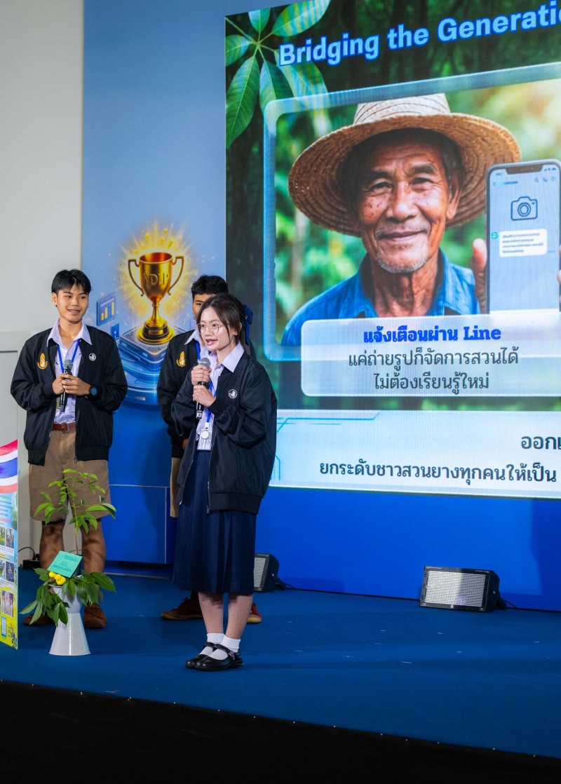สำหรับการแข่งขัน AI Hackathon ภายใต้หัวข้อ “My Future Community - ชุมชนแห่งอนาคต” ครั้งนี้ ผู้ชนะเลิศ ที่ได้รับเงินรางวัล 50,000 บาทพร้อมถ้วยรางวัลชนะเลิศ ได้แก่ ทีมตาสระอิสระโอ จาก รร.เบญจมราชูทิศ จันทบุรี ภายใต้ผลงาน “RubberGuard AI” คือการสร้าง “My Future Community” สำหรับชาวสวนยางจันทบุรี โดยใช้ AI ช่วยเพิ่มผลผลิต 20-50% ลดสูญเสียจากโรคใบร่วง ลดการจ้างแรงงานแพง และป้องกันการโค่นต้นยาง ผลลัพธ์ที่คาดหวัง คือ ชาวสวนมีรายได้มั่นคงและยั่งยืน ชุมชน กลายเป็น Smart Agri Community ที่ใช้เทคโนโลยีจริง ลดปัญหา แรงงานสูงวัย และรักษาพื้นที่สวนยางให้คงอยู่